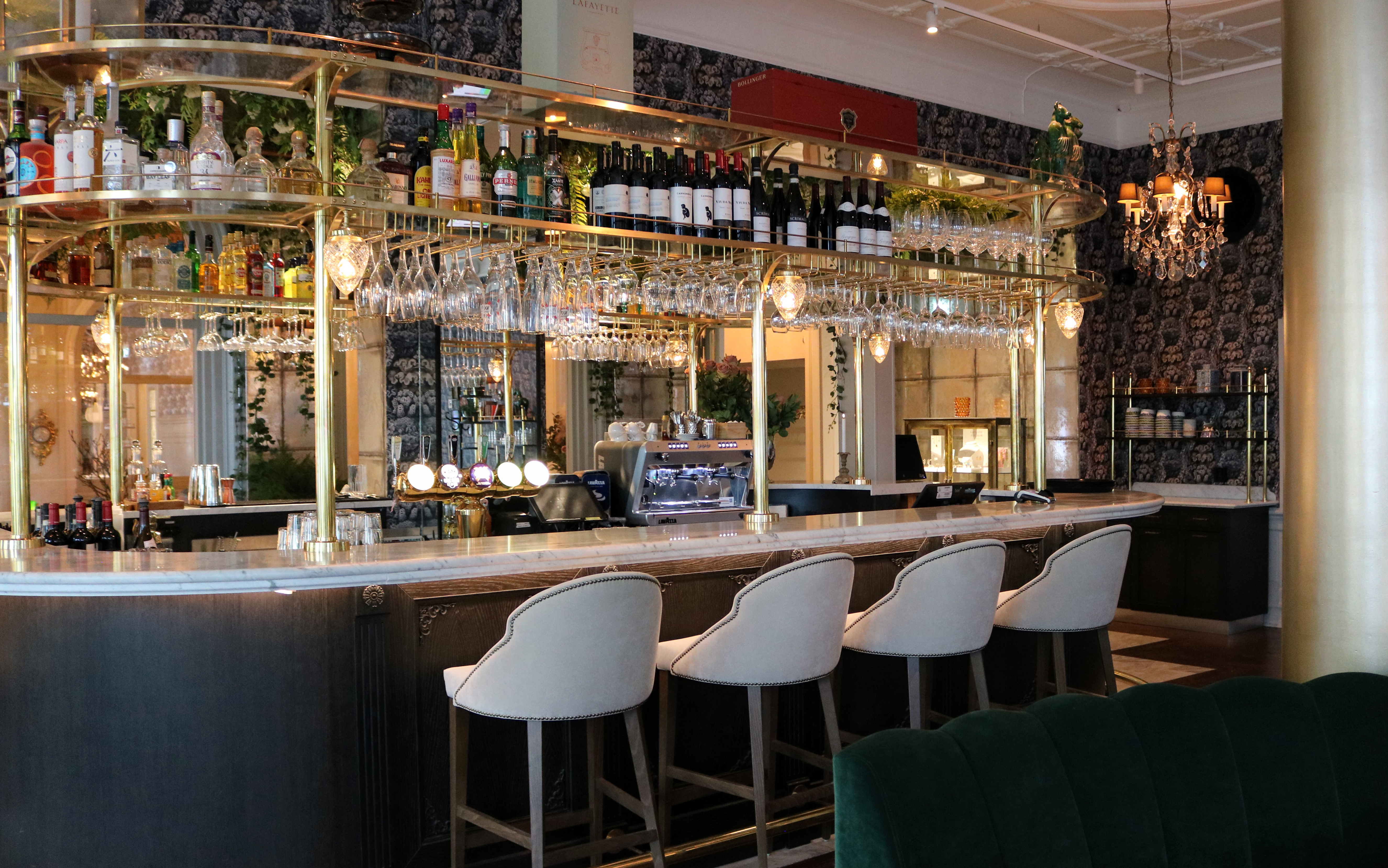 Du sitter skönt i den nyrenoverade matsalen med vacker rund bar som trivsam vän på ett glas vin, en öl eller en skakad cocktail.