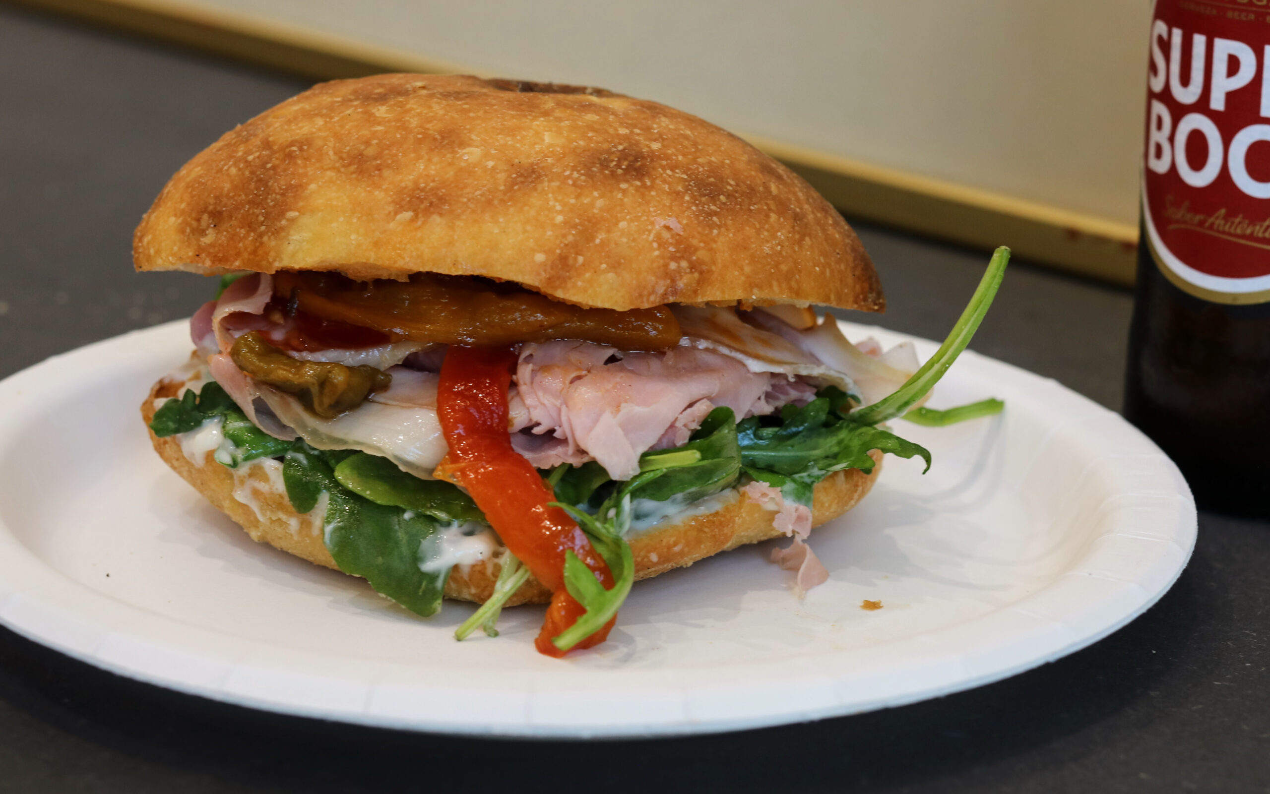 Är man lunch- eller eftermiddagshungrig går det alldeles utmärkt att slå sig ner på enklare möblemang för att käka något. Ställets matiga mackor och smakrika sallader serveras spartanskt på papptallrikar medans öl och vin dricks ur riktiga glas.