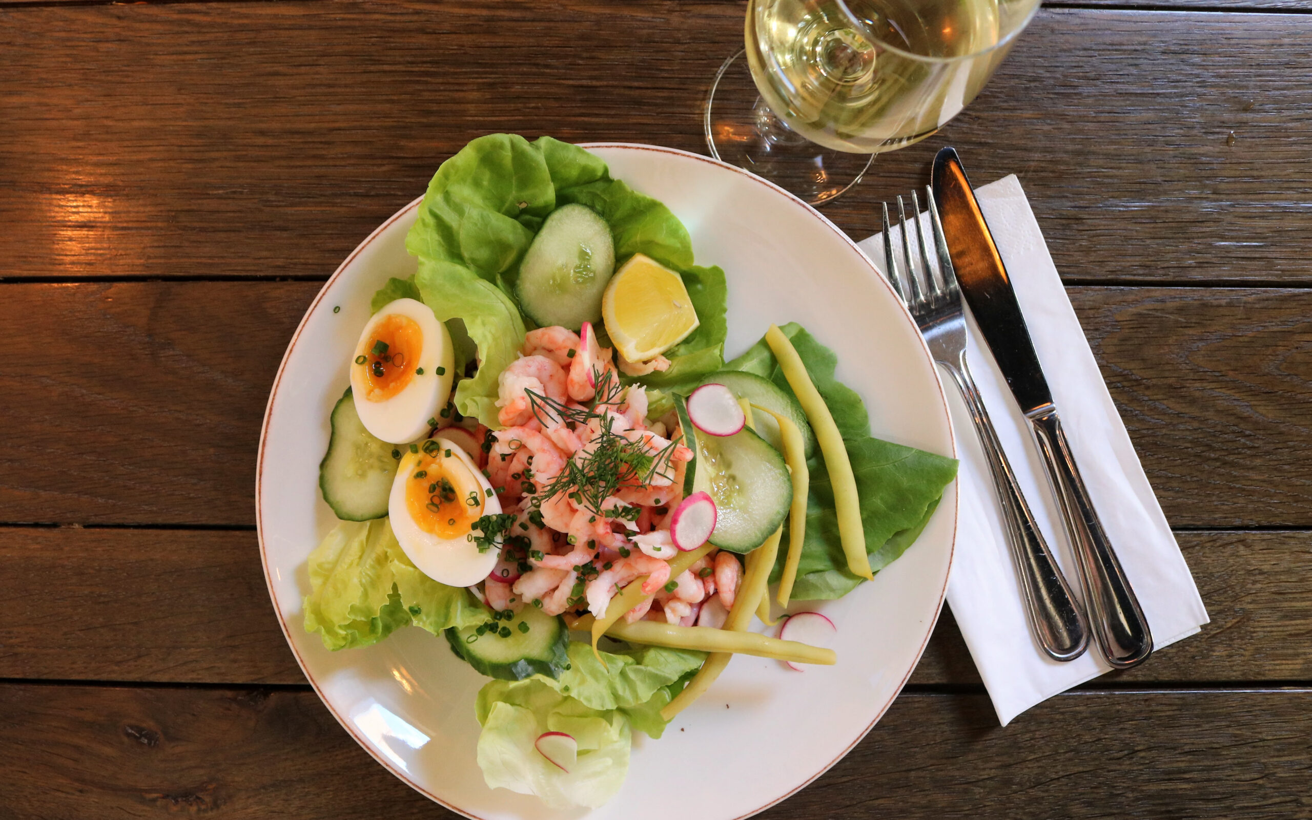 Med vacker utsikt över hamnen eller i den lummiga trädgården kan du njuta av en räkmacka på kavring med majonnäs, räkor, ägg, gurka, rödlök, vinägrett, citron och dill. Mackan kan fås både som mellan och stor.